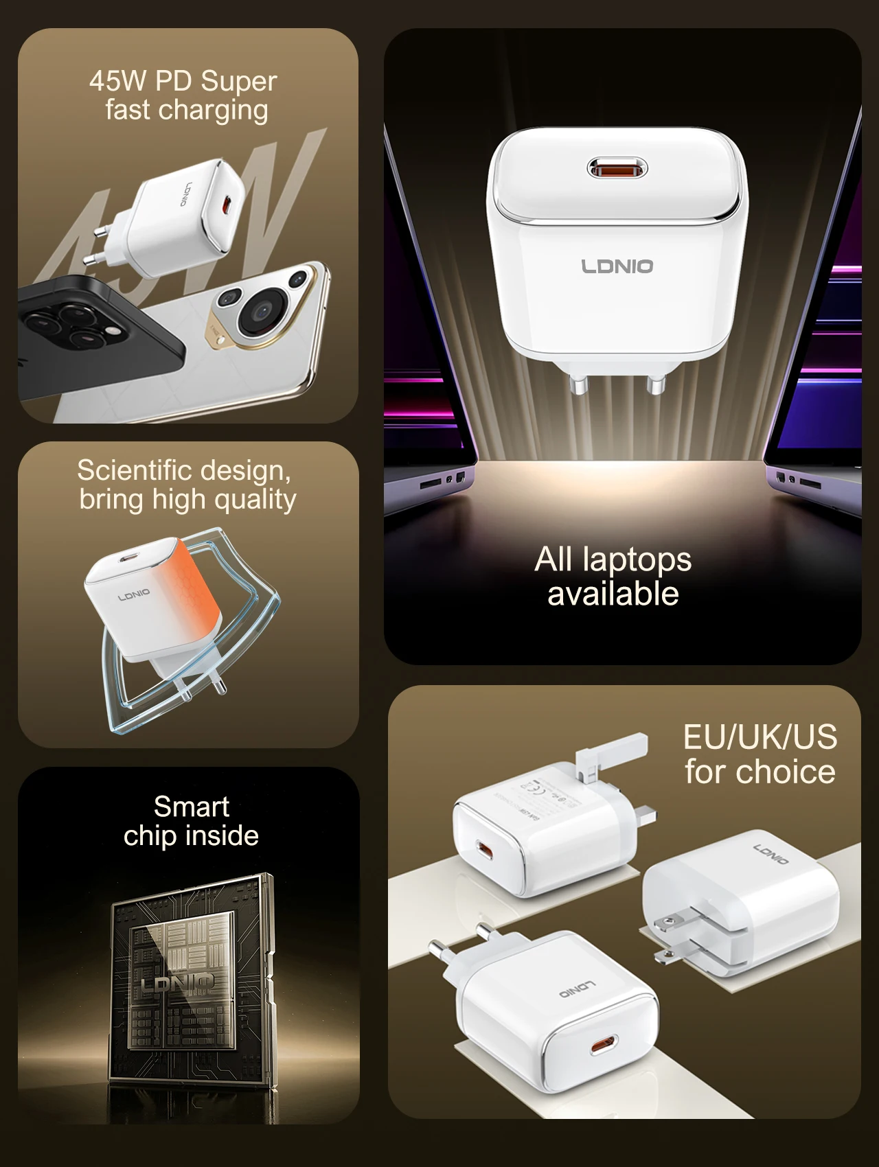 LDNIO Q6 45W GaN Multi Port Usbc Fast Mobile Charger Adapter Portable Charger for Cell Phone